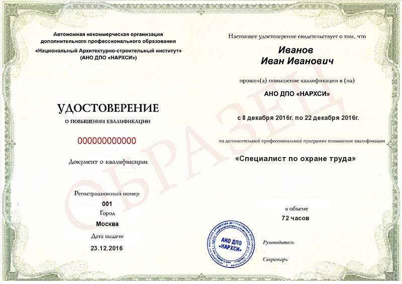 Удостоверение о повышении квалификации Подтверждает, что вы прошли обучение по программе «Специалист по охране труда» в АНО ДПО «НАРХСИ». Действует на всей территории РФ.
