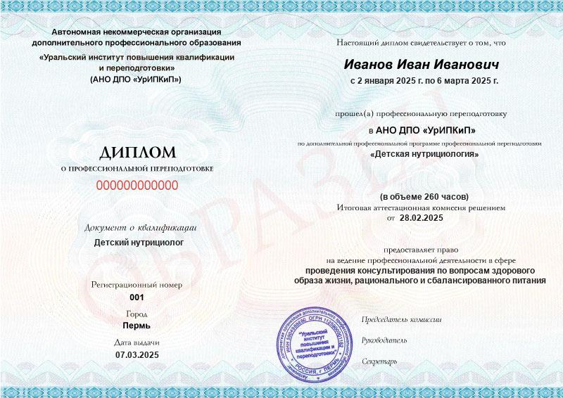 - Образец диплома о профессиональной переподготовке.