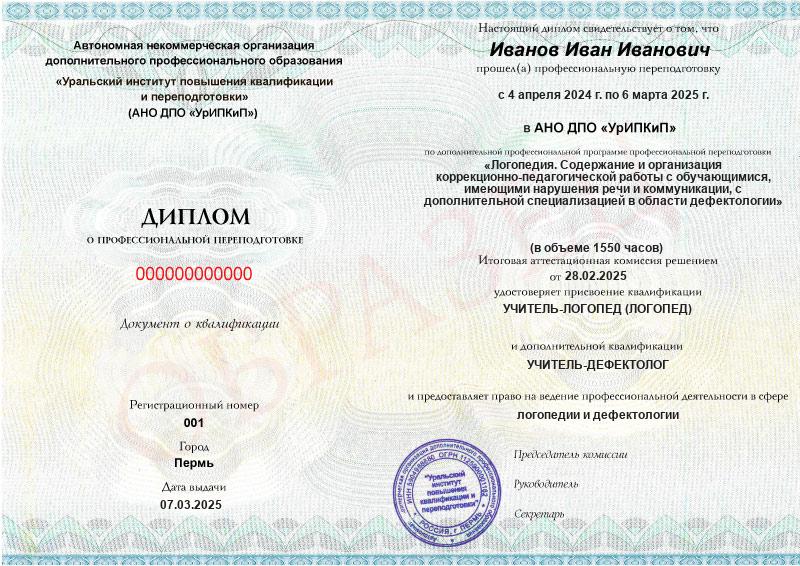 Диплом о профессиональной переподготовке с двумя квалификациями «Учитель-логопед (логопед)», «Учитель-дефектолог» (1550ч).Диплом действует на территории всей России и признается государственными и частными организациями.