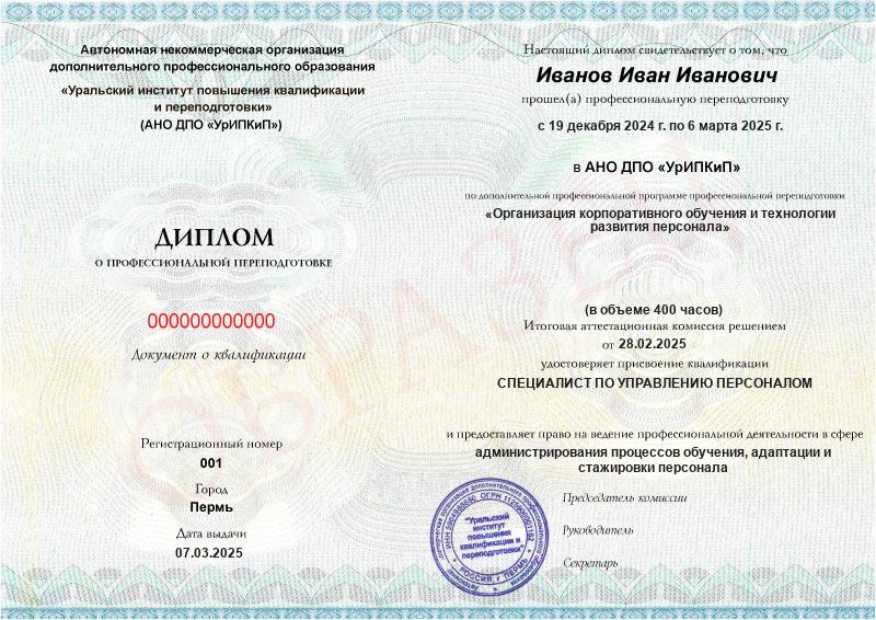 Да, дипломы и удостоверения оформляются в соответствии с действующим законодательством РФ. Документы печатаются на специальных бланках, заверяются печатью АНО ДПО «УрИПКиП».