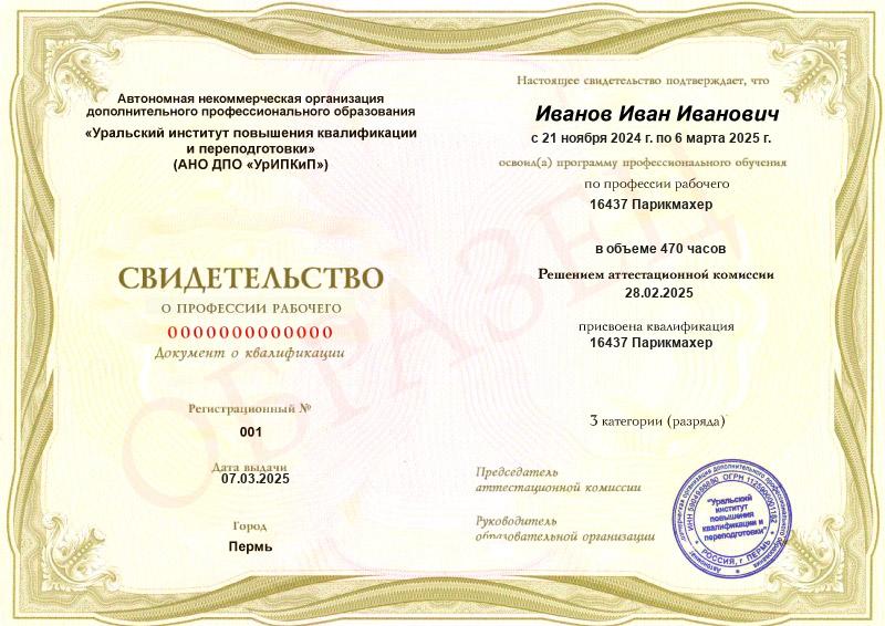 - Квалификация: 16437 Парикмахер