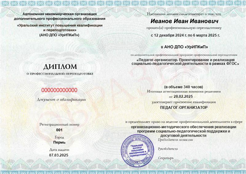 Да, дипломы и удостоверения оформляются в соответствии с действующим законодательством РФ. Документы печатаются на специальных бланках, заверяются печатью АНО ДПО «УрИПКиП».