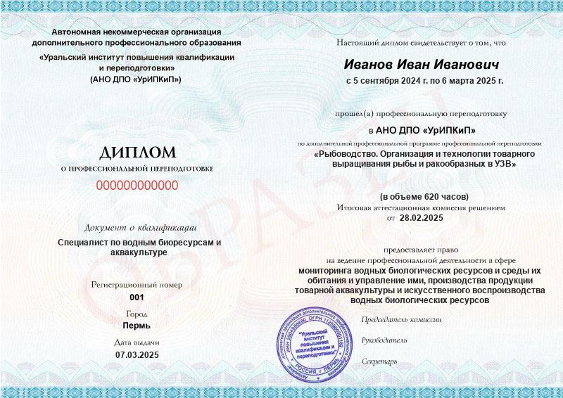 - Диплом о профессиональной переподготовке с присвоением квалификации «Рыбовод». Вносится в Федеральный реестр документов об образовании.