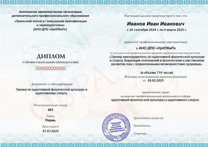 - Квалификация: Тренер по адаптивной физической культуре и адаптивному спорту